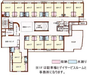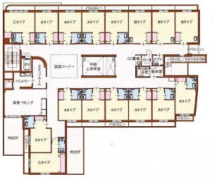 | 居室面積 | Aタイプ:1人部屋、10畳・トイレ、洗面台及び クローゼット付 |